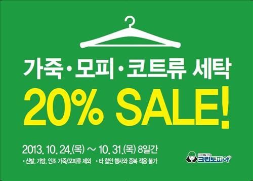 (서울=연합뉴스) 김종우 기자 = 세탁전문 프랜차이즈 크린토피아는 24일부터 8일간 `가죽·모피·코트류 세탁 20% 할인 이벤트'를 진행한다.